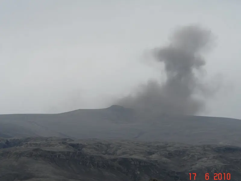 Gosvirkni var þó ekki alveg lokið, því á milli 4. og 8. júní og á 17. júní urðu nokkrar sprengingar í gígnum. Talið er að þær hafi aðalega verið gufusprengingar en þó gæti lítið magn af kviku hafa komist á yfirborðið og valdið þeim. Smá aska myndaðist við þessar sprengingar og öskublandaður gufumökkur steig upp frá eldstöðinni, en askan dreifðist eingöngu á jökulinn sjálfan. 17. júní markar því endann á gosvirkni í Eyjafjallajökli og er það kannski vel við hæfi. Ljósmyndin var tekin af Ólafi Eggertssyni, bónda á Þorvaldseyri, kl. 14:36 á 17 júní. Myndin sýnir lítið öskuský sem annað hvort myndaðist við síðustu sprenginguna í gígnum, eða er aska sem þeyttist upp í loftið vegna gufusprengingar í gígnum. Næsta mynd er tekin tveimur tímum seinna og var askan þá fallin til jarðar og engin virkni lengur í gígnum.