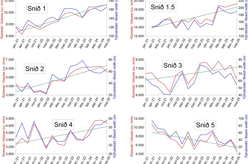Til að skoða breytingar í fjörunni á milli mælinga er breidd fjörunnar í 1 m hæð reiknuð út ásamt rúmmáli sniðsins við hverja mælingu, og þær útkomur bornar saman við fyrri mælingar. Niðurstöðurnar má sjá í töflunum og gröfunum hér til hliðar.