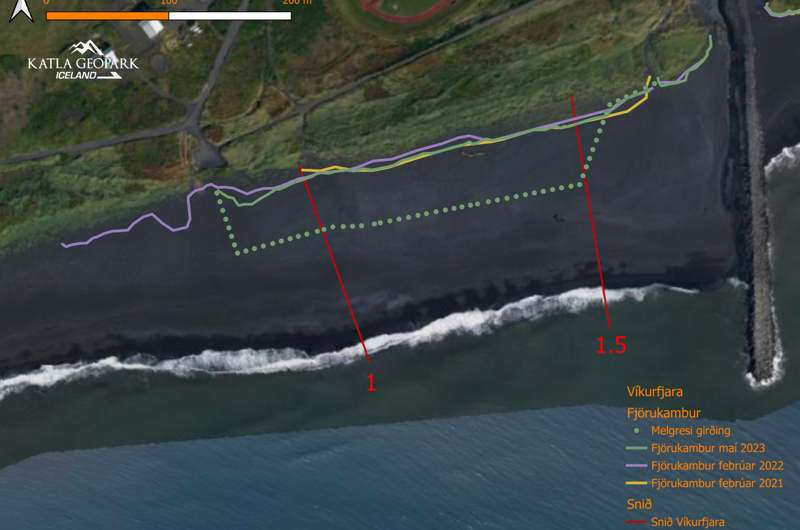 Fjörukamburinn hefur verið mældur þrisvar og má sjá mælingarnar á myndum 5 og 6. Eins og sjá má á mælingunum þá hafði fjörukamburinn í vesturhluta Víkurfjöru, við snið 1 og 1.5, aðeins gengið til baka á milli 2021 og 2022, en er nú byrjaður að ganga fram. Fjaran hér er búin að byggjast upp hratt á undanförnum árum, síðan fyrsti sandfangarinn kom, og er gamli fjörukamburinn kominn það langt inn í land að hann er orðinn stöðugur og sjór nær ekki lengur upp að honum í stormum. Nýr fjörukambur mun á endanum myndast nær sjávarmálinu, en eins og er er gróðurinn enn að færa sig nær sjónum. Mælingin í vesturhluta Víkurfjöru er því í raun mæling á gróðurlínu fjörunnar, en þessar mælingar ásamt mælingunum á sniðunum tveimur munu gefa góða innsýn inn í það hvernig nýr fjörukambur myndast. Það er því gróðurlínan sem hefur hopa aðeins og síðan vaxið, ekki kamburinn, en það er að öllum líkindum vegna hins mikla sandfoks sem var um veturinn fyrir mælinguna árið 2022. Síðan mælingin var gerð í febrúar 2022 þá hefur Landgræðslan hafið uppgræðslu á sandinum fyrir framan fjörukambinn og munu því mælingar nemenda kortleggja útbreiðslu melgresisins sem Landgræðslan sáði og þá í leiðinni sýnt hvort að uppgræðslan hafi virkað eða ekki. Á myndinni má sjá hvar sú girðing er staðsett, og verður forvitnilegt að sjá hvort að melgresið nái að breyða úr sér yfir allt svæðið innan girðingarinnar.