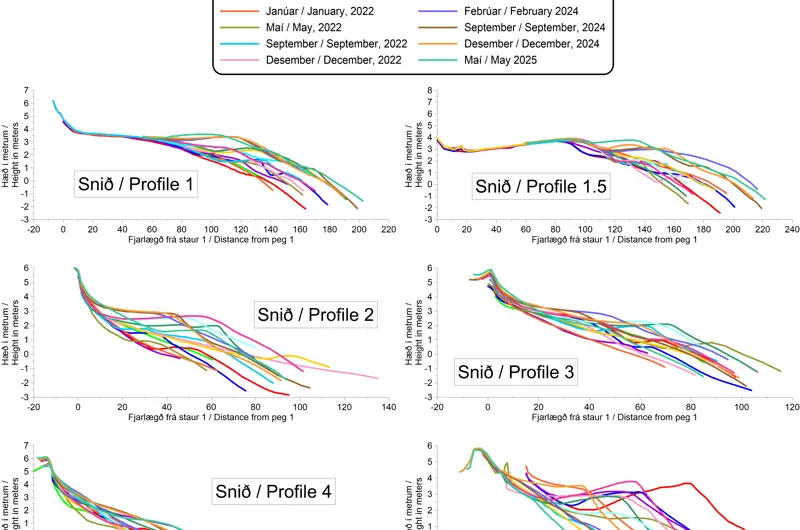 Snið 1 hefur hægt og bítandi verið að bæta við sig í bæði breidd og rúmmáli síðan mælingar hófust, en minnkaði nú aðeins á milli mælinga. Til lengri tíma þá er sniðið að bæta við sig.